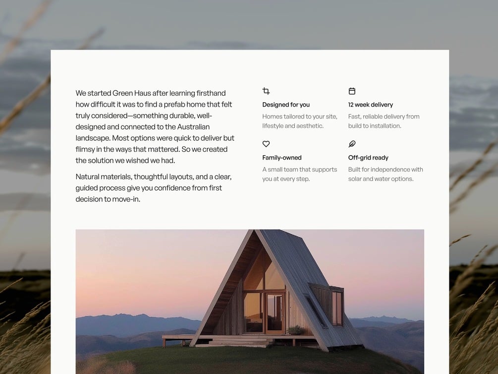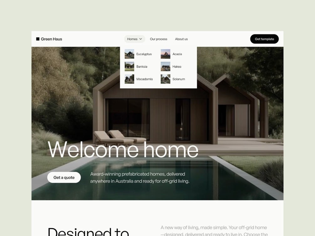 Green Haus ™ is a carefully crafted website template built for home builders and architecture firms . It gives you a polished, flexible foundation to showcase [products, services] while guiding visitors through a compelling narrative that converts. The aesthetic is minimal yet expressive, pairing modern typography with subtle motion and intentional layouts that strengthen and elevate your brand story.